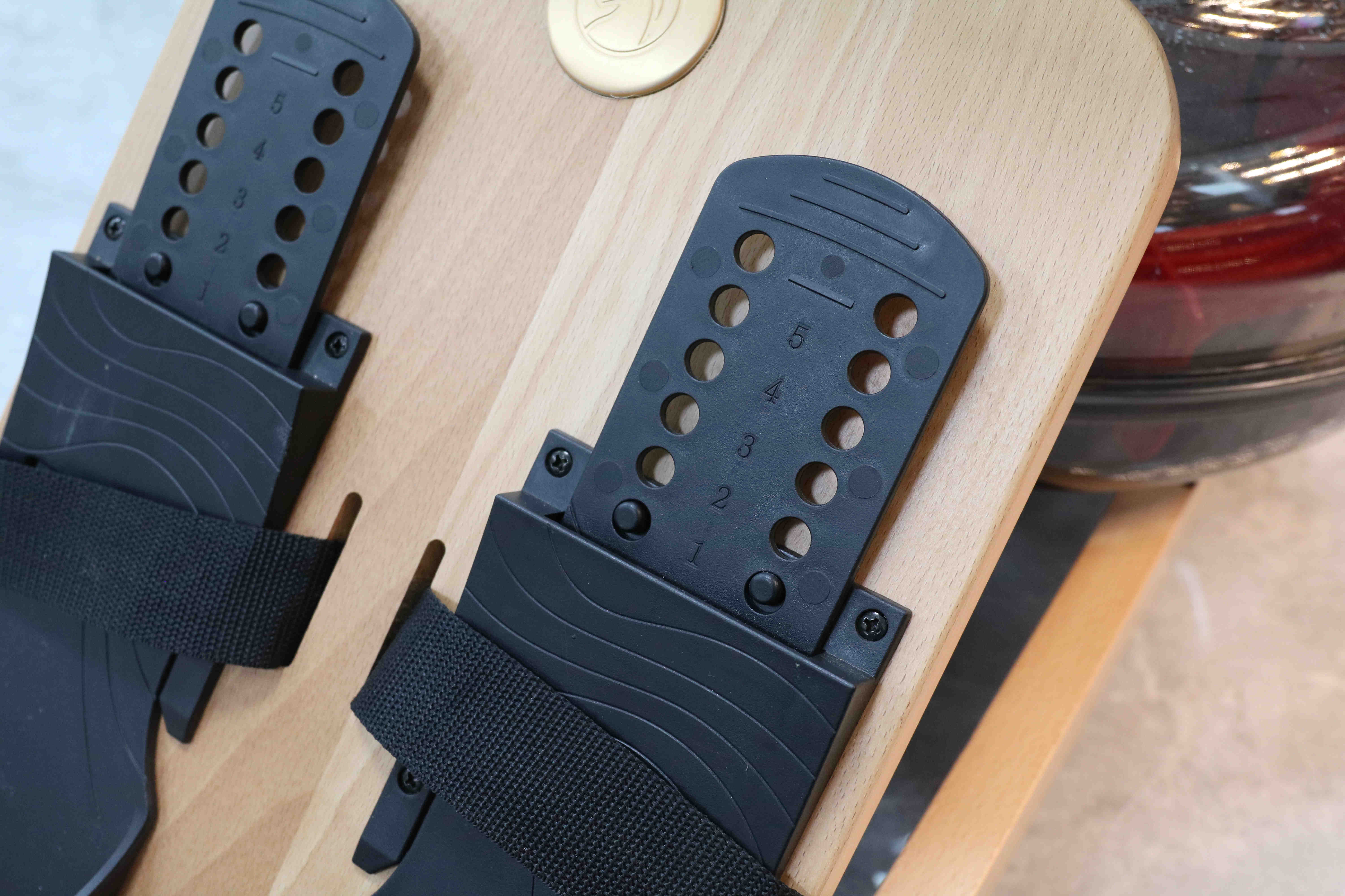 坐好以后,要把脚放在脚踏上,并系好扣绳。整个脚踏部位是倾斜的,方便我们的脚掌发力。