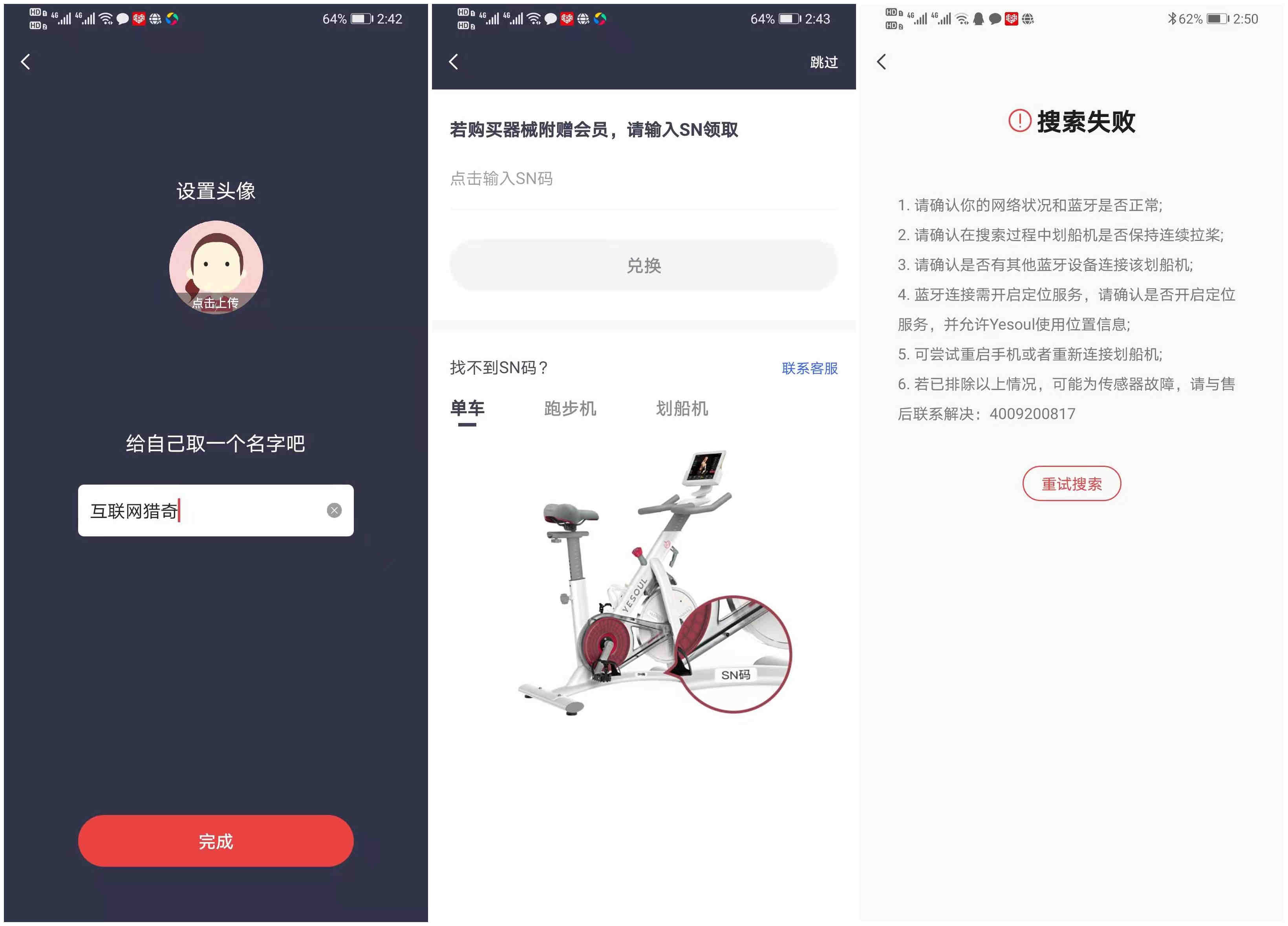 方法很简单。扫描划船机金属支架上的二维码,下载相关APP,根据提示进行注册,填入划船机机身上的SN码,再通过蓝牙将划船机和手机相连,运动的数据就会在APP上呈现。需要提醒大家的是,在进行连接时,要不停拉动拉手,让野小兽R40划船机处于运动状态。否则,手机无法检测到划船机。