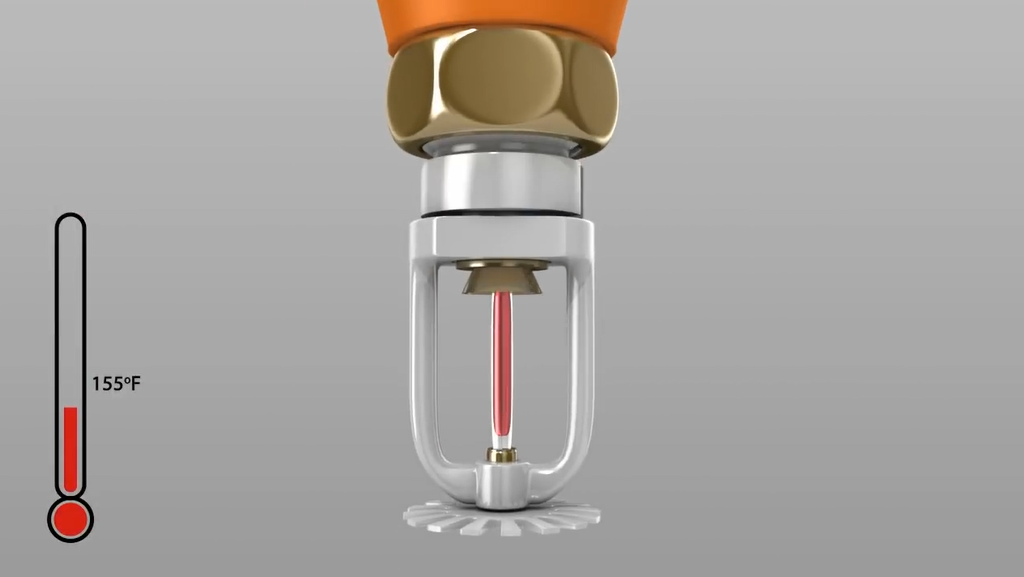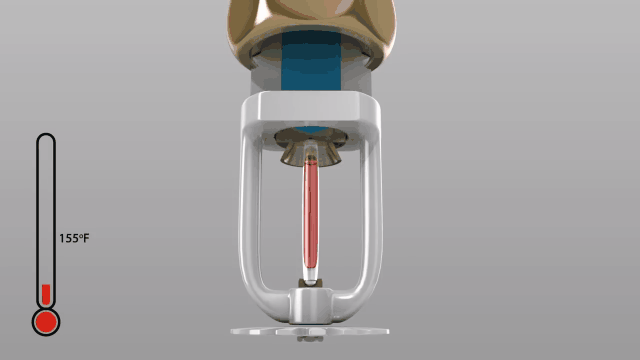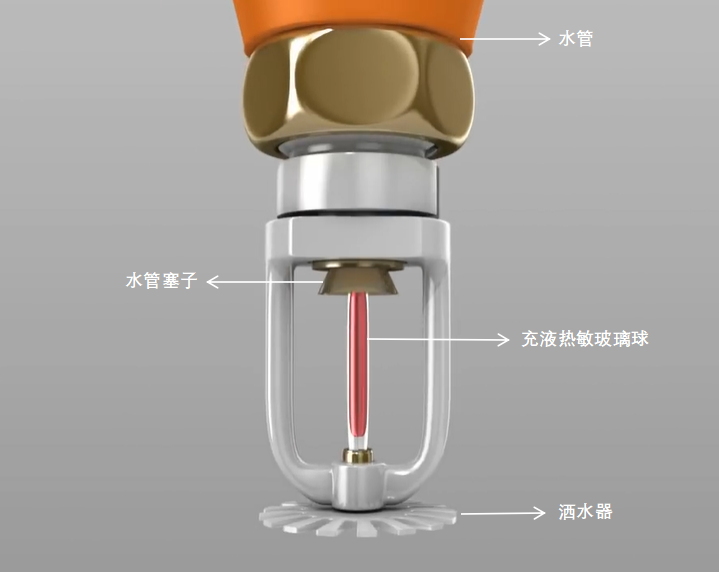 因为水总是在管道里,所以消防喷头就是处于“随时待命”状态,如果发生火灾,当空气中的温度达到足够高时,火源上方的空气温度会升高,而喷淋头中的玻璃球受到高温后,内部的液体就会开始膨胀,当超过了设定的膨胀温度后,液体就会将玻璃球挤破。