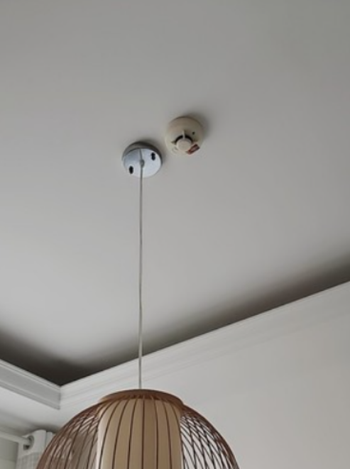 其实,这都是室内消防设备,其中闪着红灯的那个是烟雾报警器,当烟雾报警器检查到室内烟雾达到一定浓度后,间歇闪烁的红灯就会一直亮红灯,并会发出报警的声音,而天花板上另一个则是消防喷淋头。(当然也不排除会被偷偷的安装了针孔摄像头)