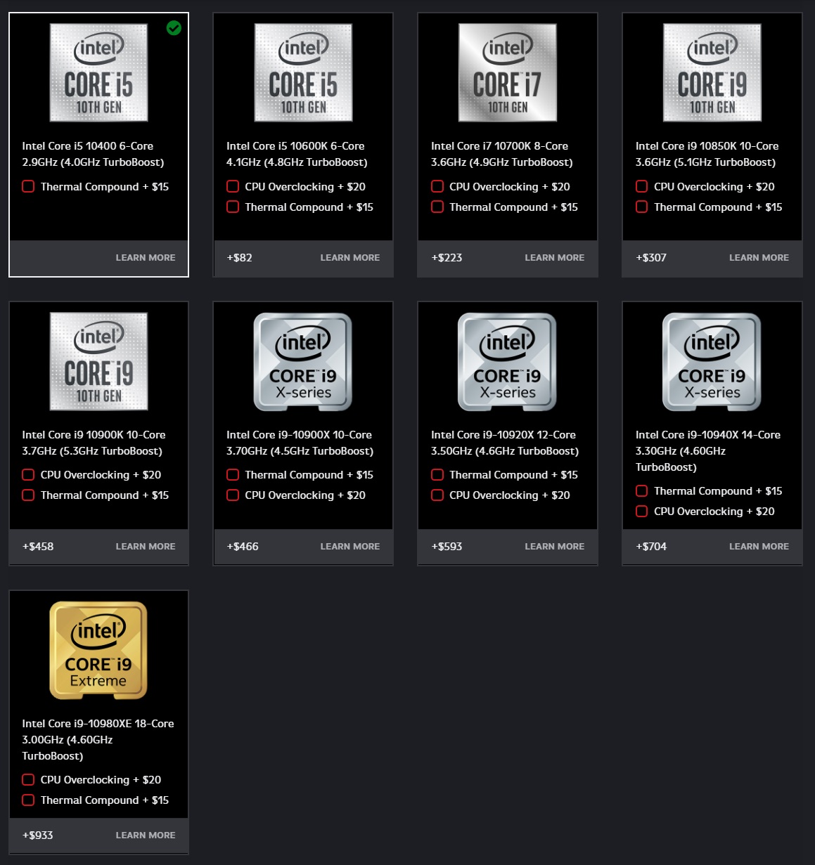 Origin RestoMod 定制主机有着丰富的配置可选,用户可以在官网定制 CPU、主板、内存、硬盘等几乎全部硬件。CPU 方面,最低配可选英特尔 i5 10400 处理器,最高可选配 AMD 线程撕裂者 3970X。支持超频的 CPU 如果想要厂家帮你设置,需要加价 20 美元,CPU 采用强化版导热硅脂也要额外花费 15 美元。