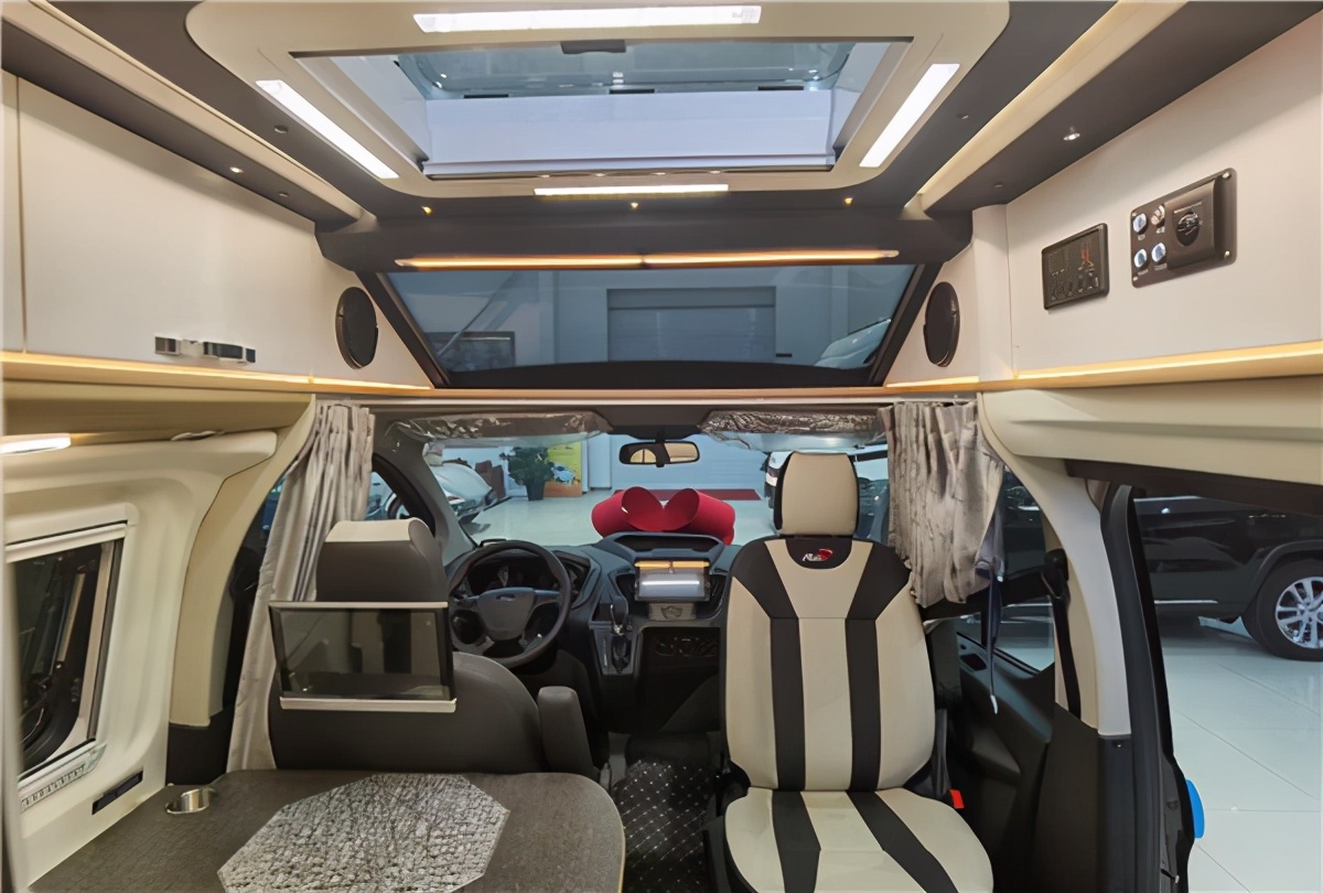 室内设计方面,作为瑞弗房车首款B级房车来说,室内色彩搭配非常不错,能给人一种耳目一新的感觉。驾驶室上方配备大尺寸钢化玻璃天窗,带有遮阳帘和防蚊帘。更为人性化的是,前挡风玻璃和驾驶室两个侧窗采用进口遮阳帘配件镶嵌。