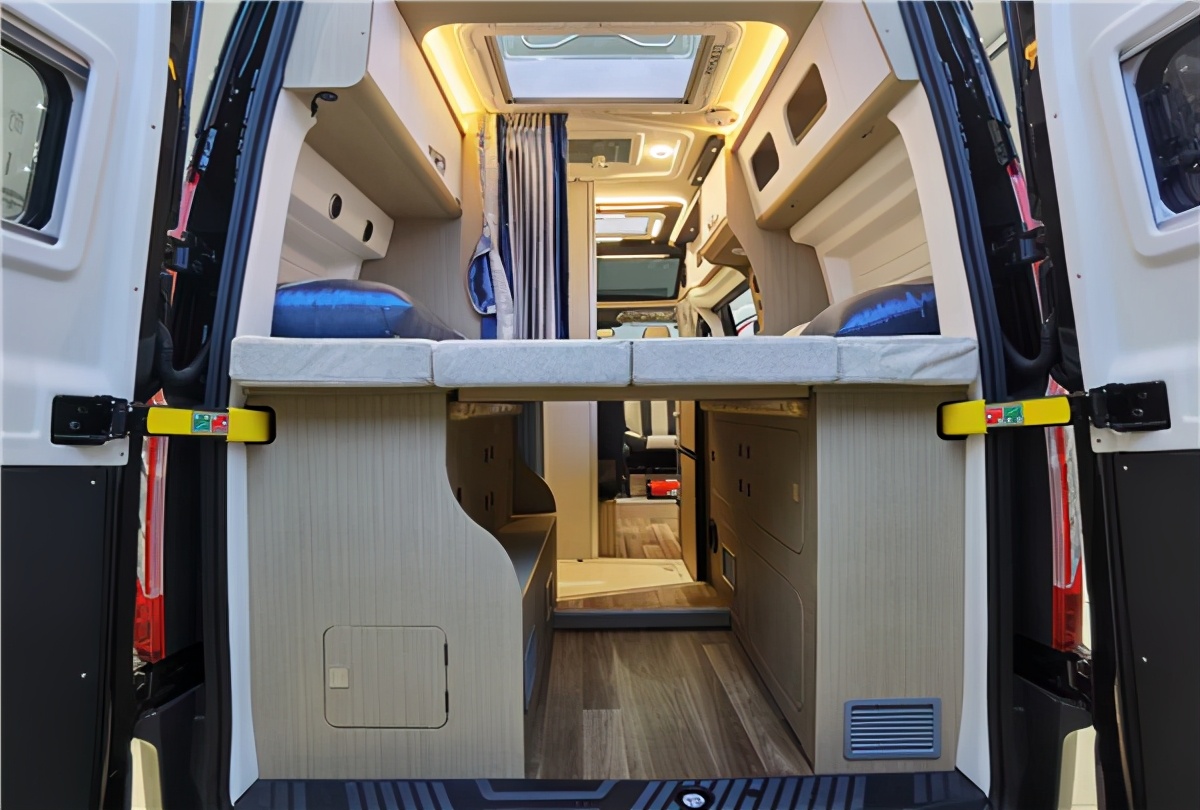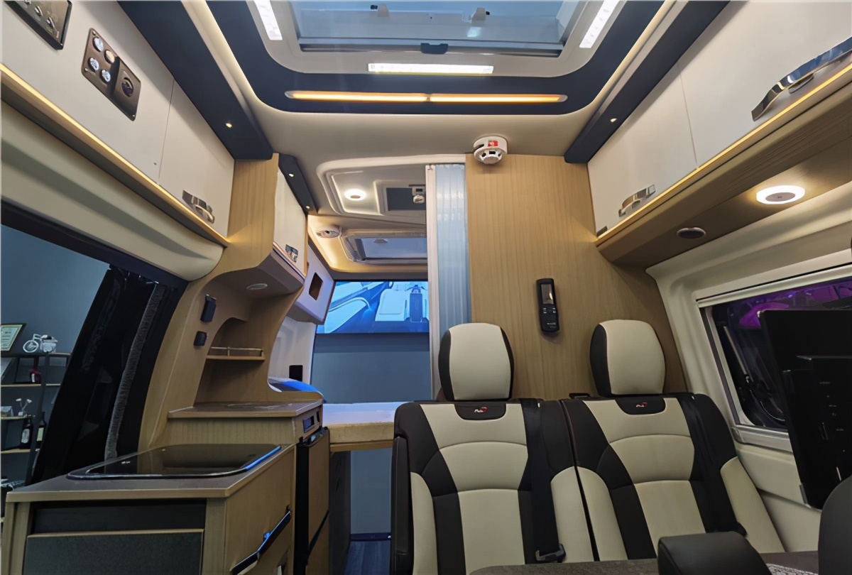 启界R500从前至后分为会客区、厨房、卫生间、休息区,虽然空间不是很大,但“麻雀虽小五脏俱全”,足够满足长途旅行的各种生活需求。此外,该车车尾是一张横置双人床,尺寸为1850×1200;而中部乘客座椅可以与可旋转副驾驶组合成一张侧向单人床;乘坐舒适性还是挺强的。