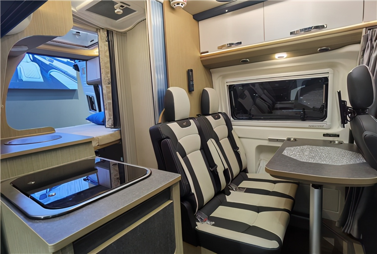 驾驶室只有副驾驶席可以享受旋转,紧接着生活区客厅部分采用双人单排座椅布置,带有可延伸的餐桌,可以形成一个3人简易会客区。