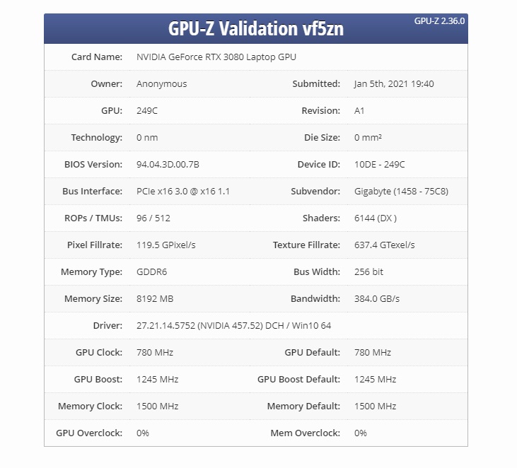 IT之家 1 月 6 日消息 外媒 Techpowerup 出品的 CPU-Z 软件上出现了新的英伟达 RTX 3080 信息,GPU 频率大幅降低,显存也从 16GB 降到了 8GB,预计为英伟达 RTX 3080 Max-Q 版本。