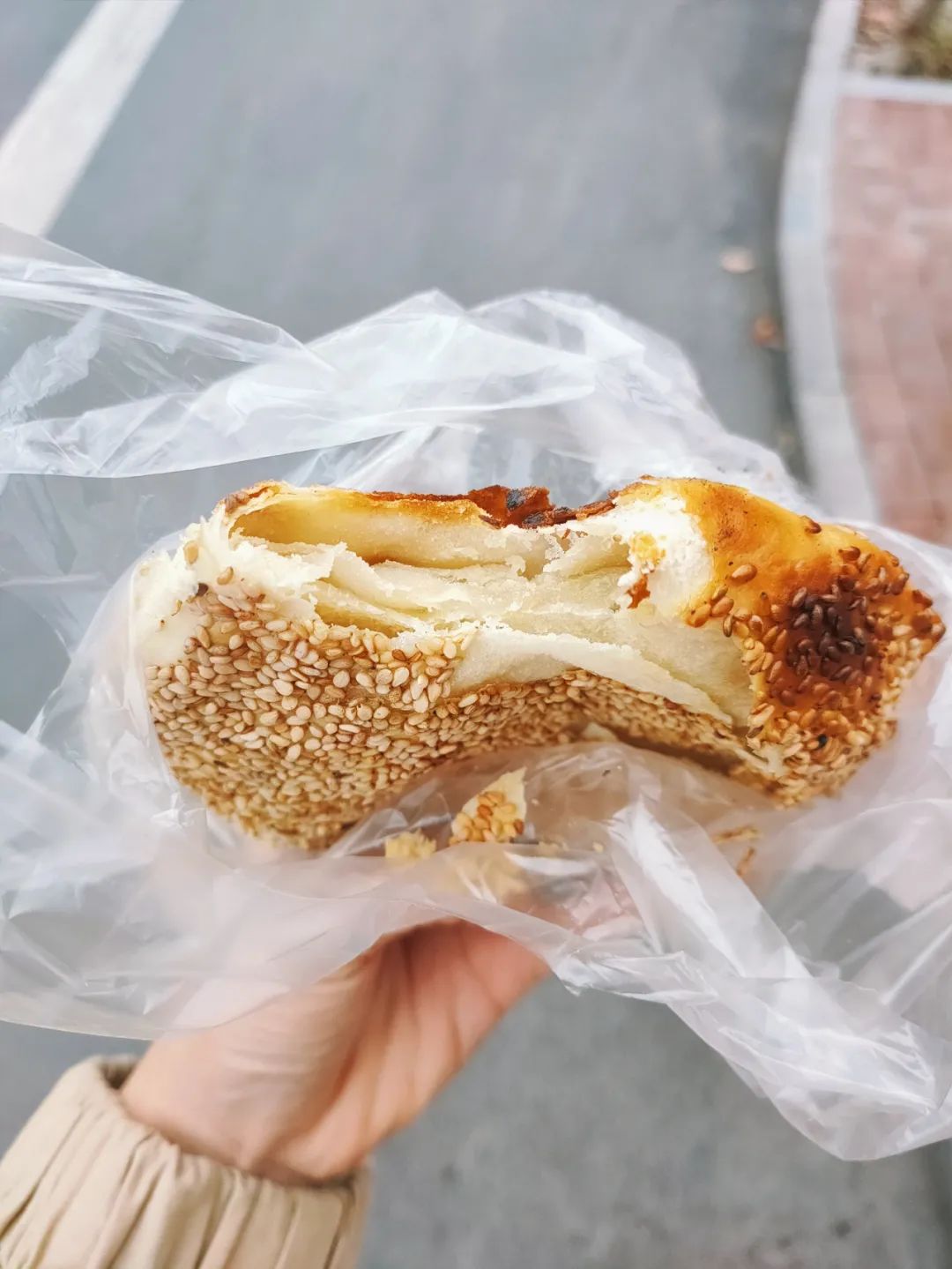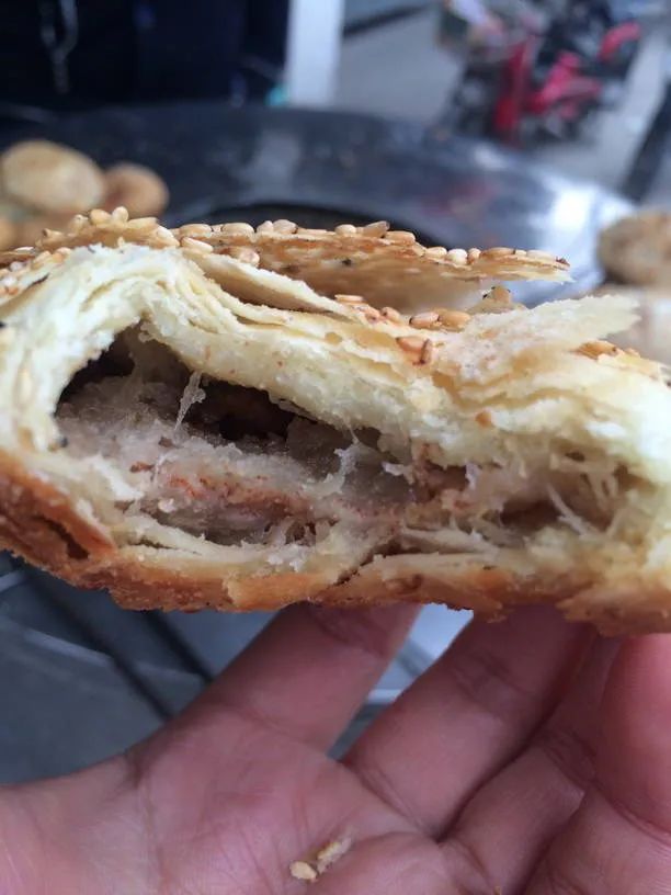 外脆里酥,表层满满的芝麻香气逼人。内馅有萝卜、榨菜、葱油……还有甜加咸烧饼,一口咬下去又甜又咸,在嘴里开启“龙虎斗”。