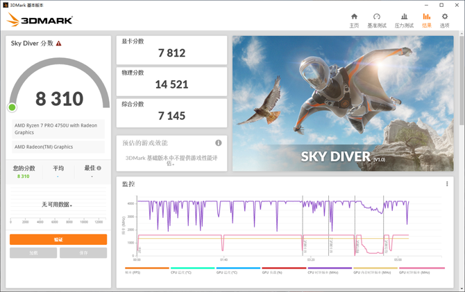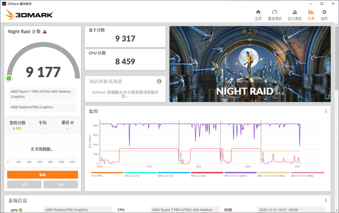 3DMARK是一款考量整机综合性能尤其是显示性能的基准测试软件,最终我们可以看到在Night Raid和Sky Diver项目中,这款笔记本的得分分别为9177和8310,作为一颗内置显卡来说,性能已经媲美入门独显,基本可以畅玩目前市面上大部分的网络游戏,比如LOL等,并且对于一般的图形处理来讲,这款处理器也能够轻松胜任,这主要得益于锐龙 7 PRO 4750U内部集成的高性能Redeon核心显卡,让用户在日常的游戏和图形处理上,有着大幅领先Intel十代移动端低压处理器的性能表现,甚至是搭载类似MX250这种入门独显的组合。