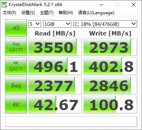 最后在硬盘性能方面,这款笔记本搭载了高性能的PCIe NVMe协议高速SSD,顺序读取可以达到3550MB/S,顺序写入可以达到2873MB/S,能够带来秒开机和应用秒载入,是目前市面上顶级的高性能SSD,并且容量为512GB,完全满足用户的日常使用需求。
