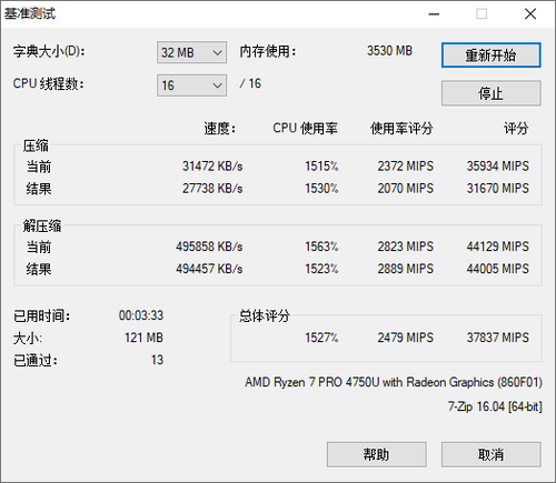 解压缩是我们日常使用非常非常频繁的软件,同样也是考量CPU性能重要功能,我们使用7-ZIP进行测试之后得到,37837MIPS的成绩表现,这样的分数领先大部分的桌面级处理器,在应对日常的应用中,同样具有非常出色的性能表现。