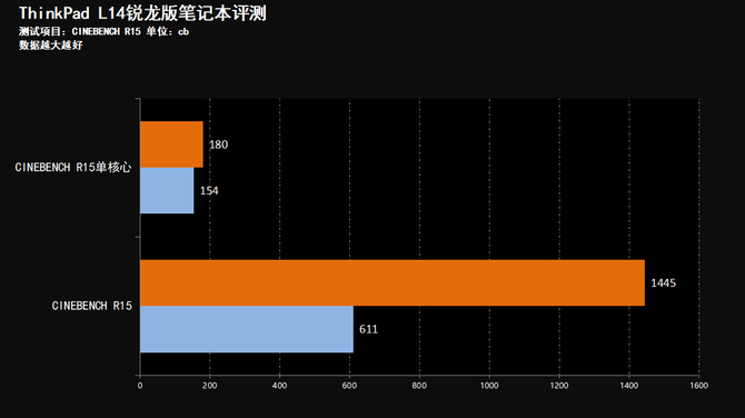 首先是CINEBENCH R15,锐龙 7 PRO 4750U的多核心得分为1445cb,单核心得分为180cb,远超Intel酷睿i7-10510U的多核心611cb和154cb,其中多核心性能领先超过136%,有着翻倍的性能领先优势,性能表现非常出色。