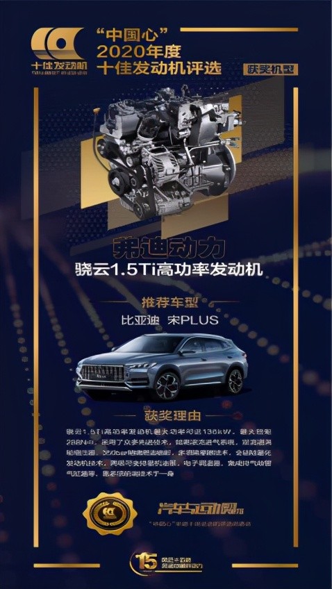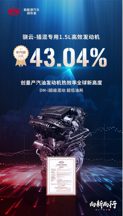 弗迪动力骁云1.5TI高功率发动机,在众多发动机中脱颖而出,荣获“中国心”十佳发动机称号;比亚迪DM-i超级混动技术的核心零部件之一,骁云-插混专用1.5L高效发动机,获得了权威机构中汽研华诚认证中心颁发的产品认证证书,以实测43.04%的热效率,创量产1.5L汽油发动机全球新高度,获得“能效之星”称号,这都是对比亚迪自主研发创新实力的肯定。