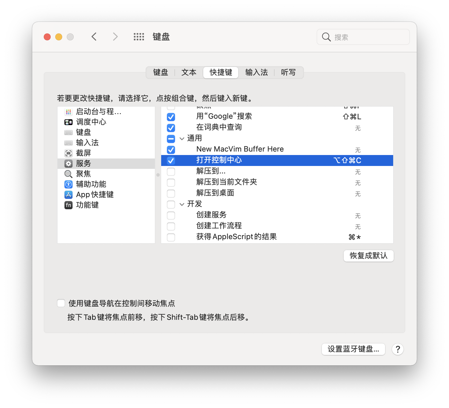 第三步:打开系统偏好设置-键盘,选择「快捷键」标签,点击左侧的「服务」。在「通用」中找到你刚刚命名的快速操作,并点击右侧「无」来录制键盘快捷键。
