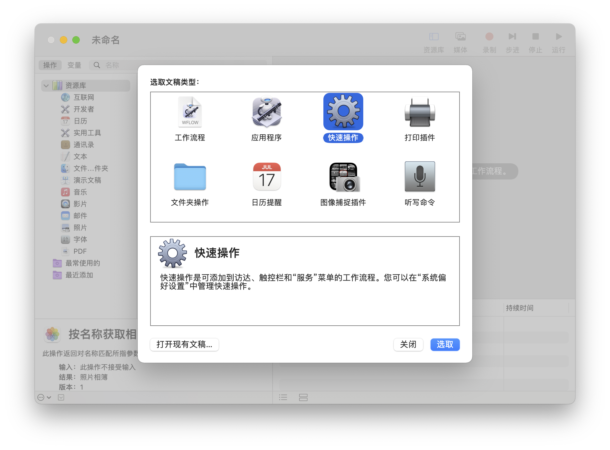第一步:打开系统自带的「自动操作」,并创建「快速操作」。
