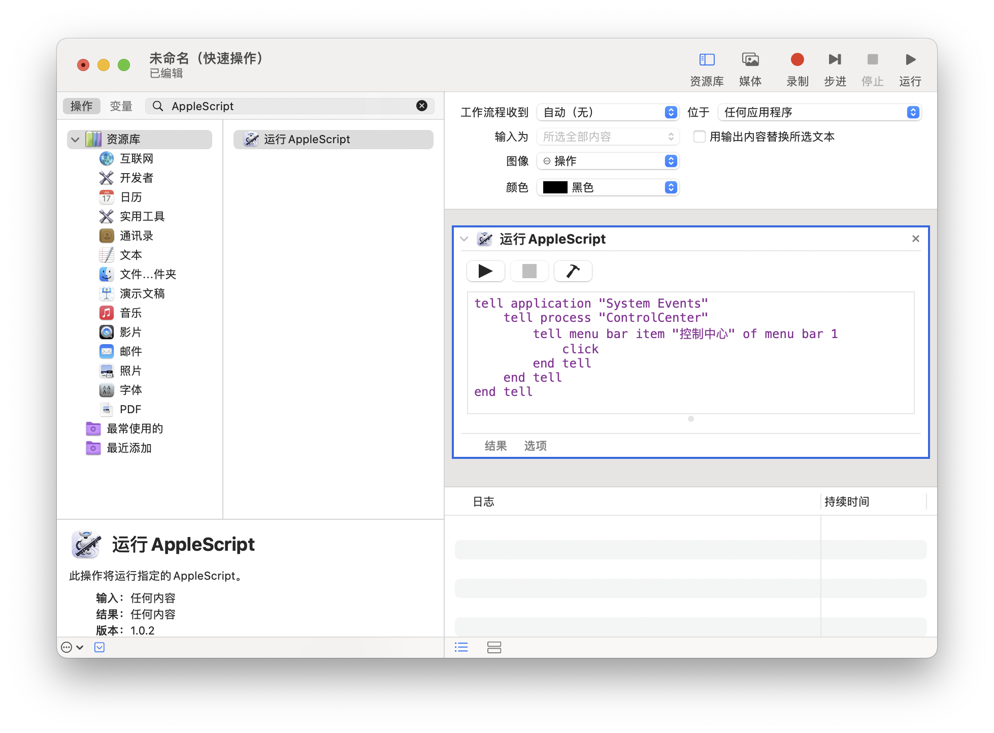 第二步:在左侧搜索 AppleScript 并将「运行 AppleScript」拖动到右侧,在窗体中键入: