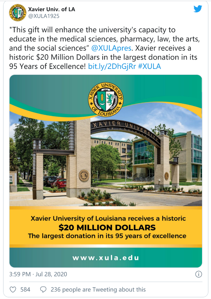 到目前为止,斯科特已向传统黑人大学、社区和技术学院以及为美洲原住民、妇女、城市和农村学生服务的学校进行了捐赠,并敦促其他人捐款给灾难慈善中心(the Center for Disaster Philanthropy)、芝加哥社区贷款基金(the Chicago Community Loan Fund)、喂养美国(Feeding America)、纳瓦霍和霍皮家庭新冠病毒救济基金(the Navajo and Hopi Families COVID-19 Relief Fund)以及从迪拉德大学(Dillard University)到密西西比州的陶格鲁学院(Tougaloo College)的传统黑人大学(HBCUs)。