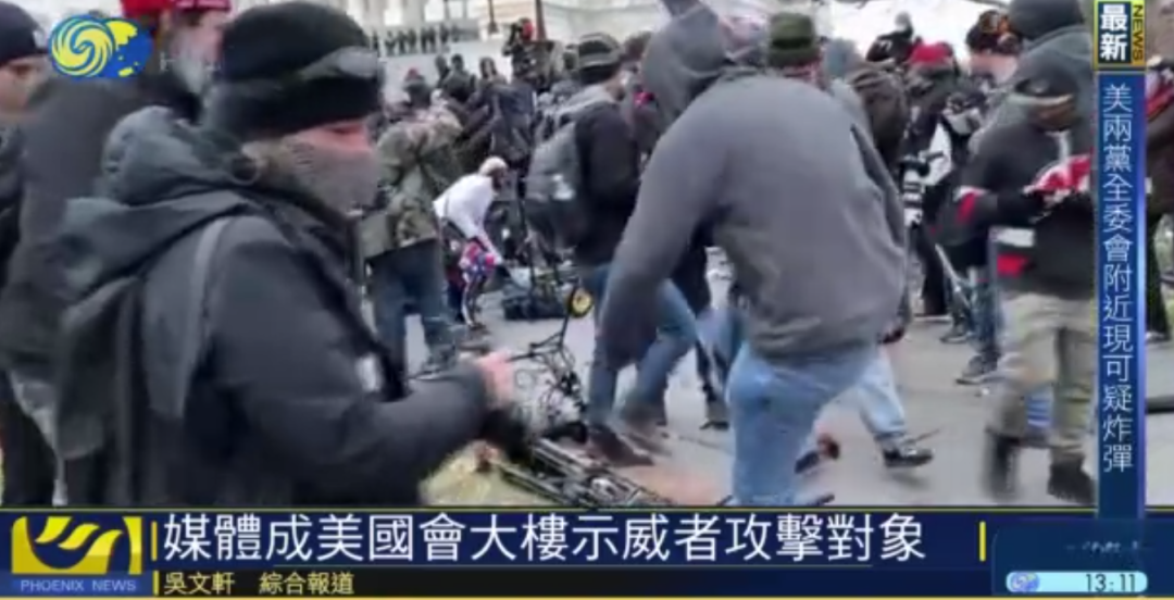 美国国会大楼内外都成为"战场",示威者除了冲入国会之外,在国会外聚集的部分示威者,期间突然向现场媒体发难,除了大骂记者外,更向记者吐口水,并大肆破坏摄影器材。