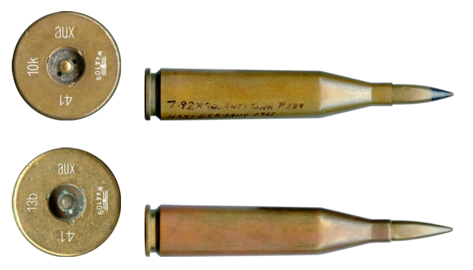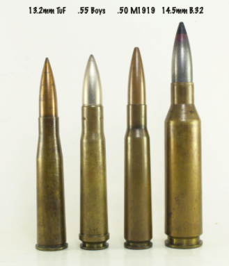 (从左到右分别是德国一战13.2mm,英军.55博伊斯,美军.50 BMG,战斗民族14.5mm)值得注意的是这四款早先用于反坦克的子弹中只有.55博伊斯采用了带环设计,他们是多怕炸膛...