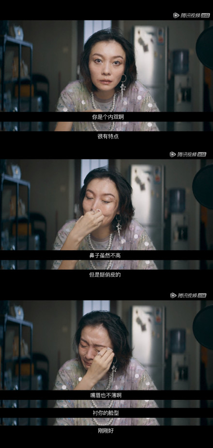 卸妆这场戏讲的是她去看整容医生的经历。在医生面前,她对自己的容貌百般挑剔。医生说她长得很有特点,瞬间击中软肋,委屈和泪在镜头面前倾泻而出。