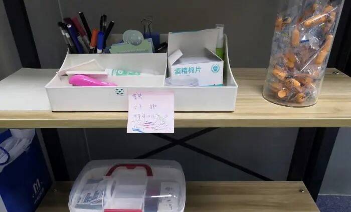 北京一家共享自习室里的公用文具和医药箱。中新网 彭婧如 摄