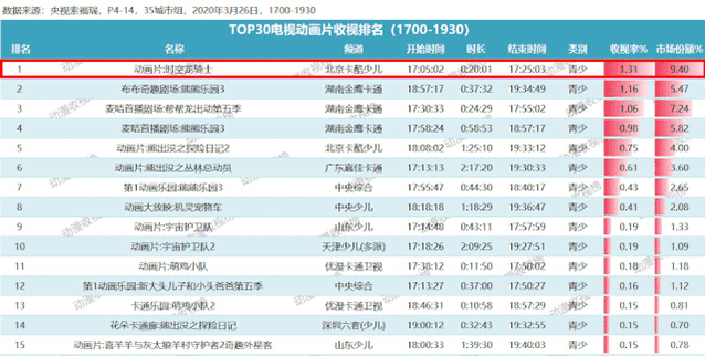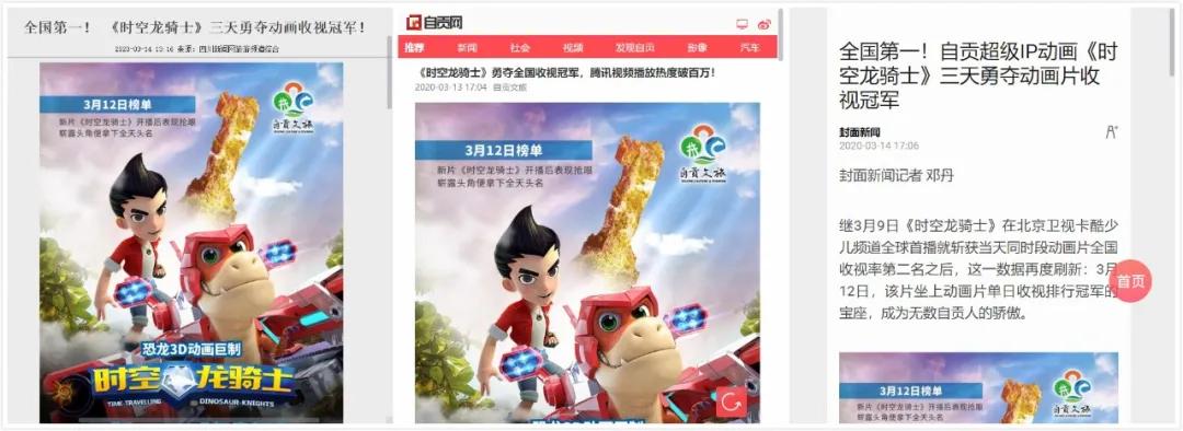 意料之中,惊喜之外,《时空龙骑士》于2020年3月9日北京卡酷少儿首播当天便斩获同时段大屏收视冠军。此后便高歌猛进,以黑马之姿陆续摘得桂冠,成为三四月份收视最高的动画之一,此番惊人成绩受到了各个主流权威媒体集中报道。