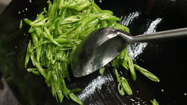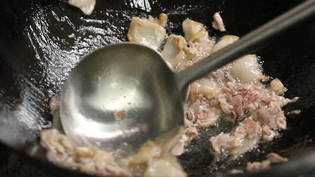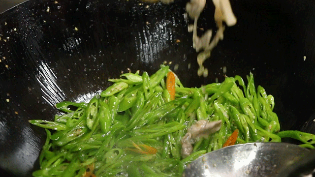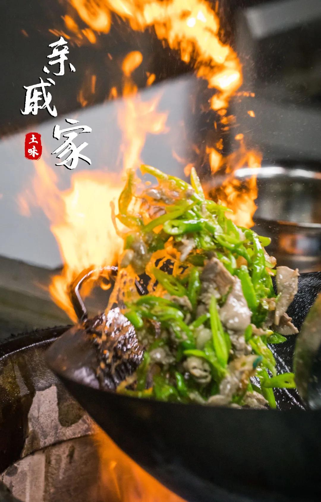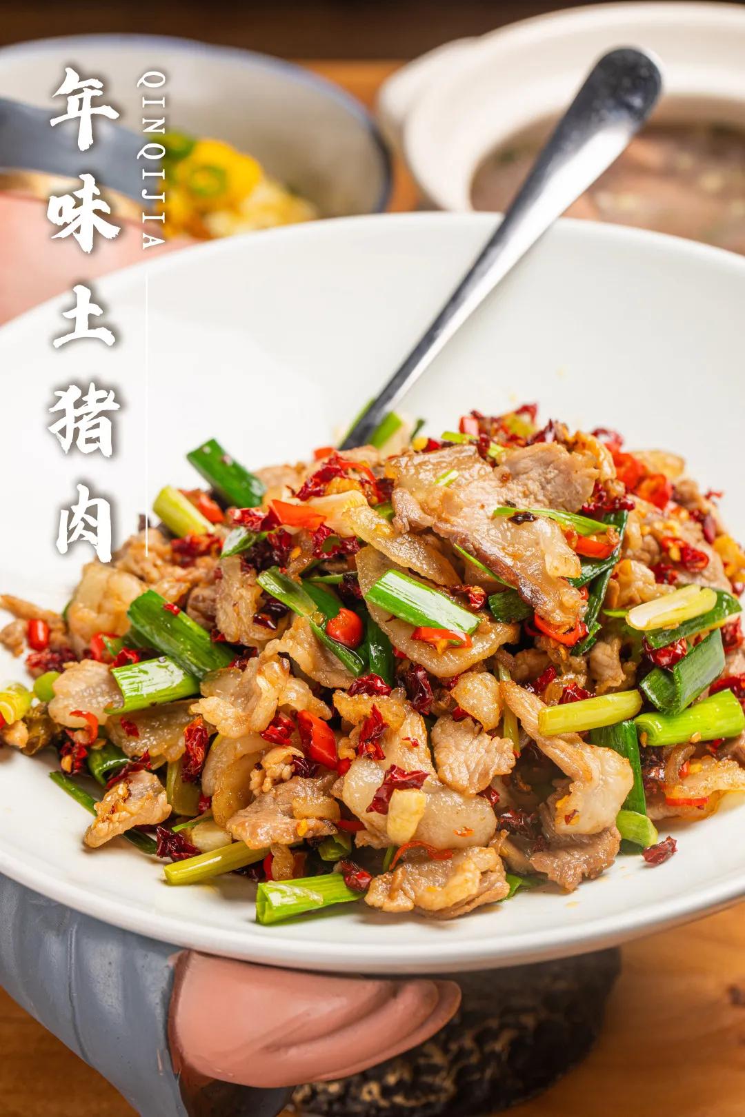 掌勺这道菜的厨师必须要有臂力,颠锅、猛火是这道菜的精髓!在大火翻炒70秒必须出锅,确保土猪肉的肉质鲜嫩,牢牢锁住了原汁原味~