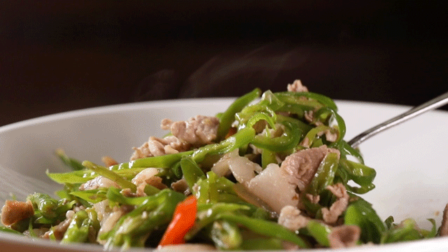 爆炒后的小鲜肉表面泛着诱人光泽,香味窜入鼻腔,迫不及待地夹上一筷入口,细腻鲜嫩的土猪肉十分顺滑、弹牙!