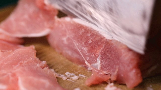 肉质细嫩、肉味鲜美,逆着纹路一刀下去,每一块大小一致,现切现下锅!