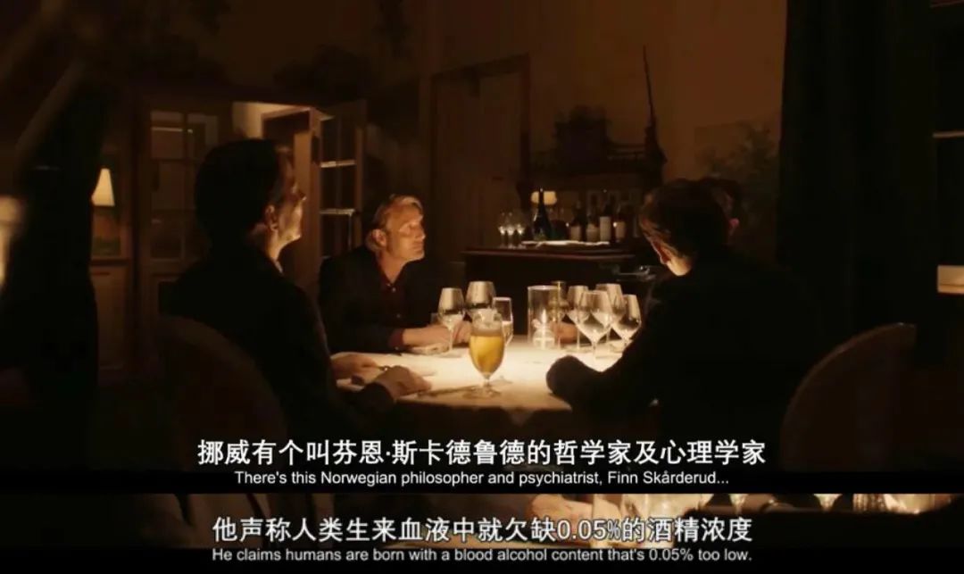 《酒精计划》里,一群深陷中年危机的中学老师以挪威心理学家芬恩·斯卡德鲁德(Finn Skårderud)的这个假说为由,开始了自己的“合理”饮酒计划。他们的生活当然并没有因为饮酒就真的变好,但电影里那些喝到正酣快乐起舞的镜头,也很让人感动。