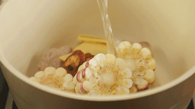 第三步:加水至盖过所有食材,隔水炖三个半小时,慢火熬炖。