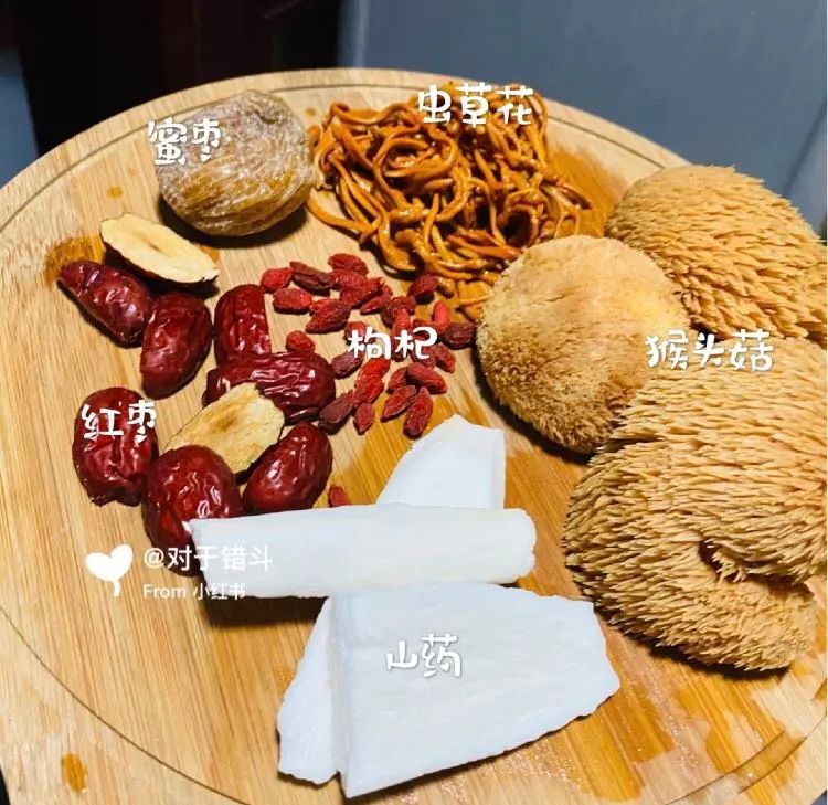 👉猴头菇瘦肉汤:瘦肉200g、猴头菇15g、干淮山15g、茨实10g、莲子10g、党参8g、红枣三四粒