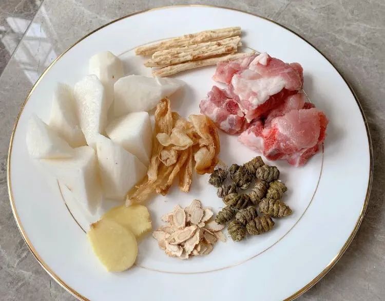 👉花旗参石斛滋阴汤: 大骨两块,沙参、花旗参各5g,石斛10g,花胶15g,生姜两片,淮山一根