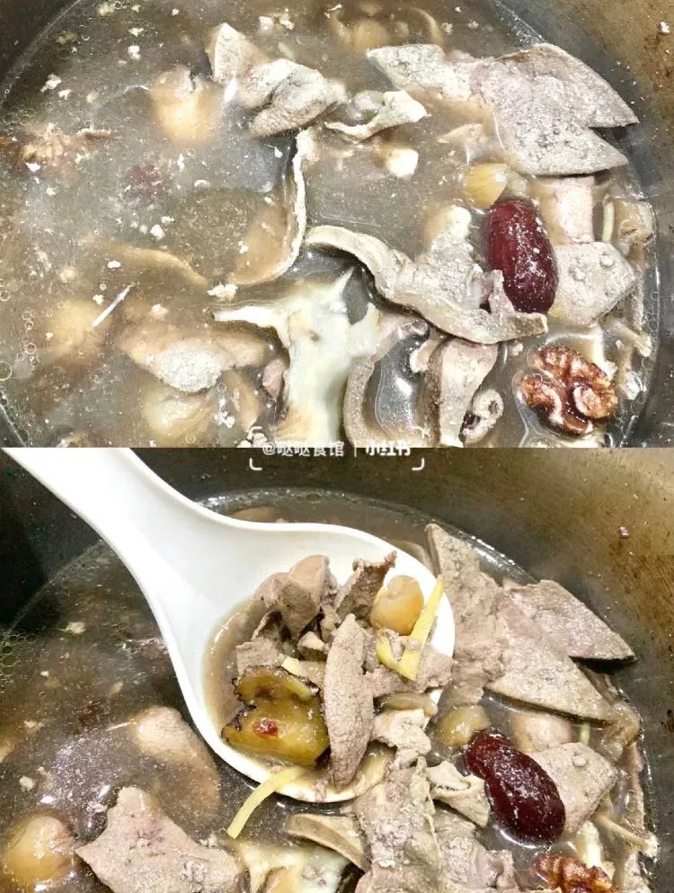 👉党参当归猪肝汤:猪肝250g、当归5g、党参5g、桂圆3颗、枸杞10颗、红枣5颗、核桃2颗、几片老姜