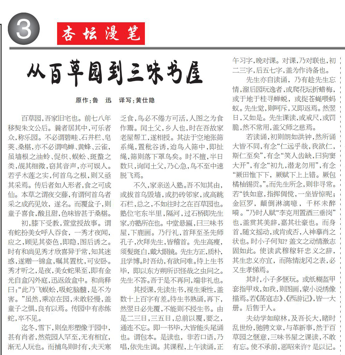 夫幼學如瓊林,及吾長大,睹時亂世紛,馳騁文章,與革新事,然於百草園之愜意,三味書屋之課讀,不敢有忘。使不承前,恶昭來許?是以記。
