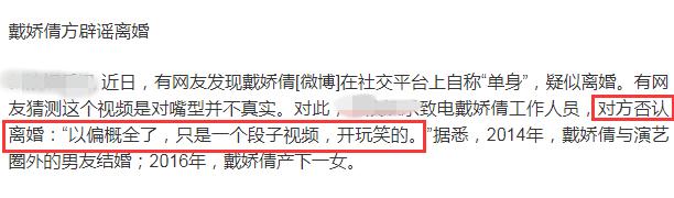 随后,有媒体致电戴娇倩工作人员,戴娇倩的工作人员否认离婚一事,称这只是一个段子视频而已,开玩笑的。