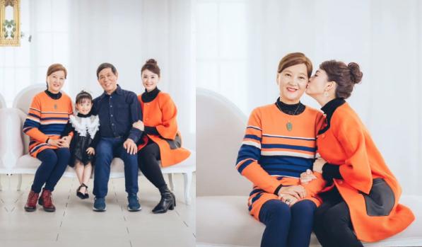 照片中,戴娇倩把长发盘起,身穿橘红色外套,内搭黑色高领毛衣,看上去非常知性有气质。只见戴娇倩面带笑容地挽着父亲,女儿则坐在戴娇倩父母中间,一家四口,其乐融融。只是在这一组照片里,却没有戴娇倩老公的身影。
