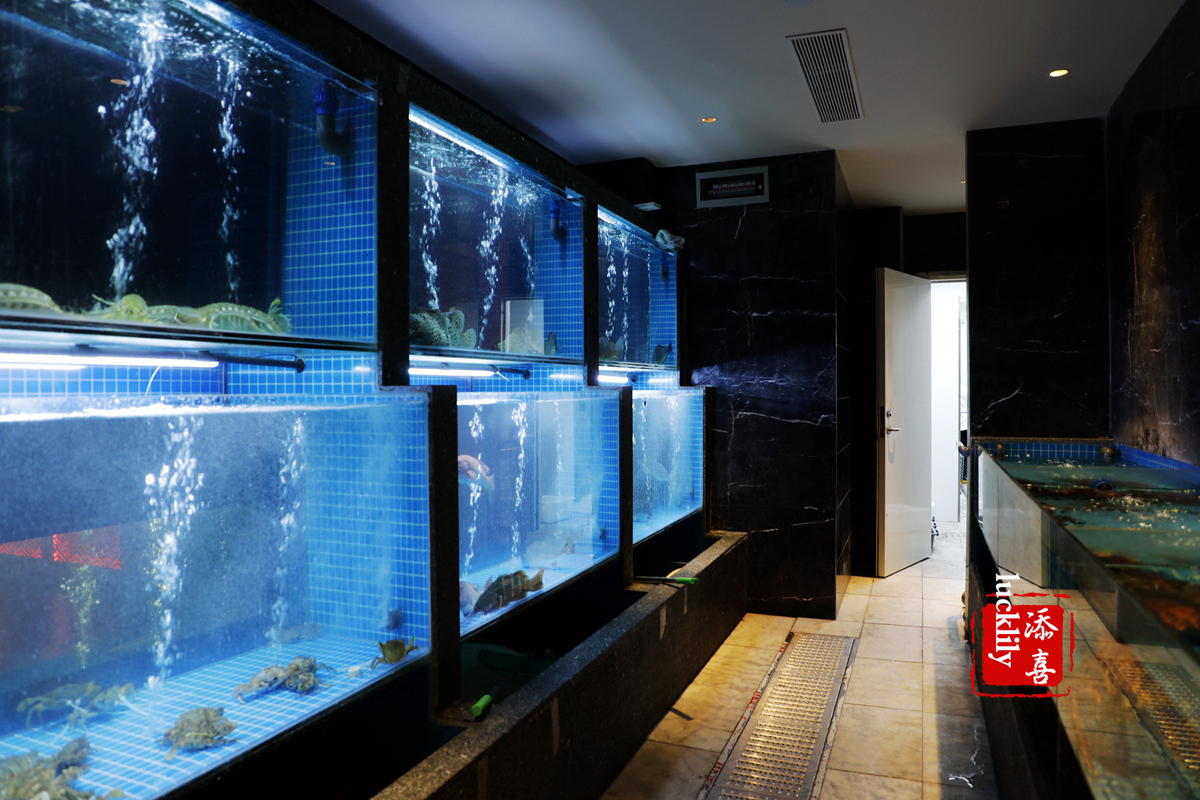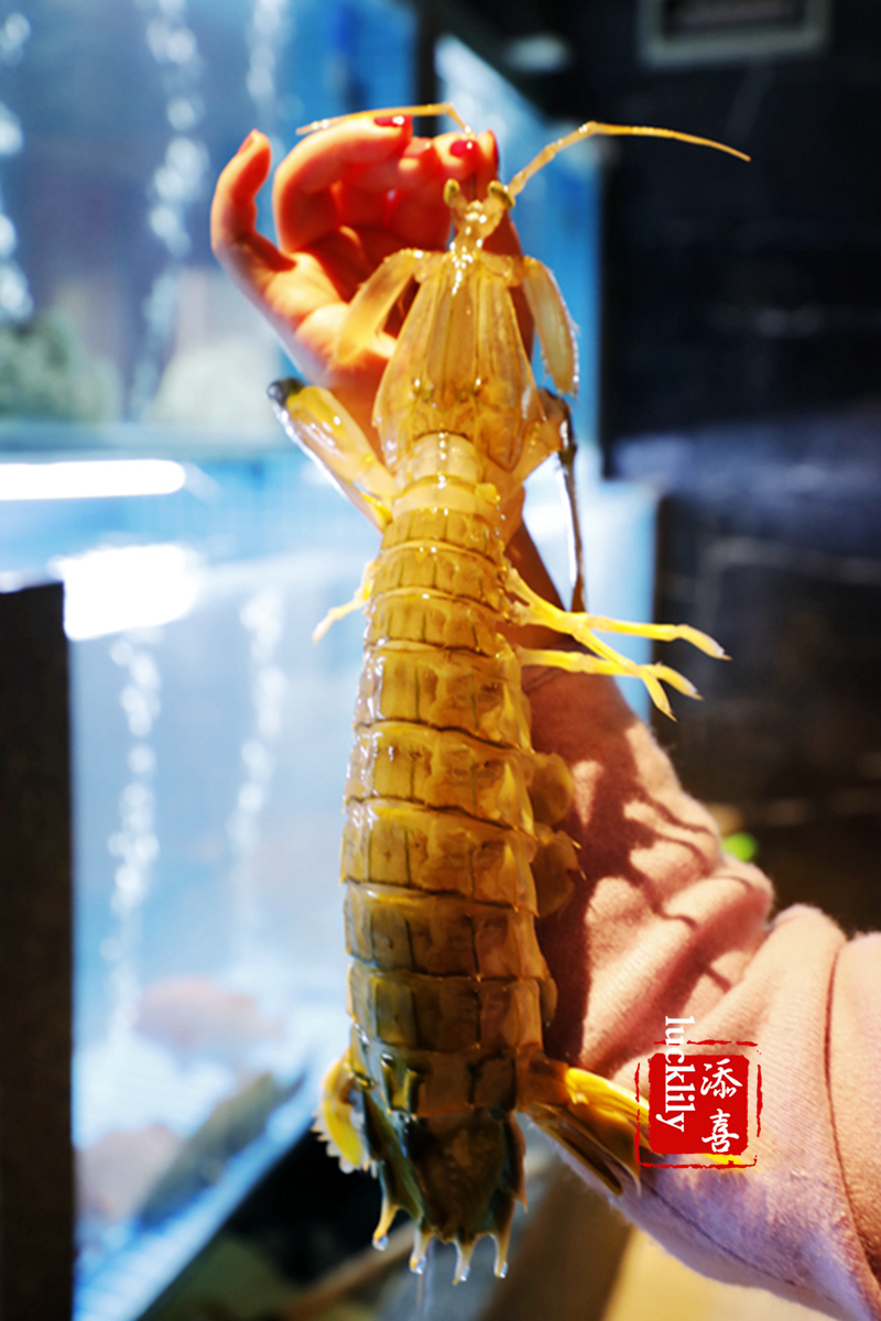 水族箱是全透明的,一侧就在走廊边,走过去初以为还是观赏鱼缸,另一面就是海鲜房里面,逗了一会儿手臂长的皮皮虾,看上去生猛,其实脾性好还温柔。