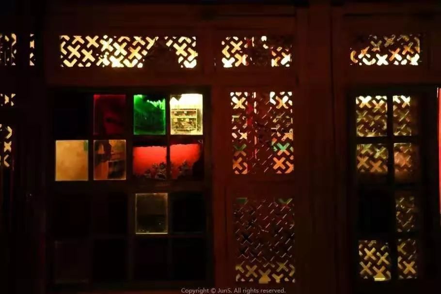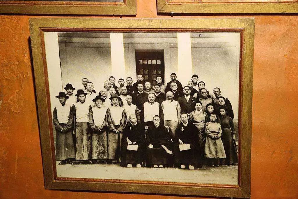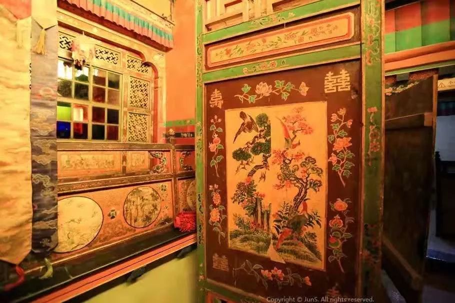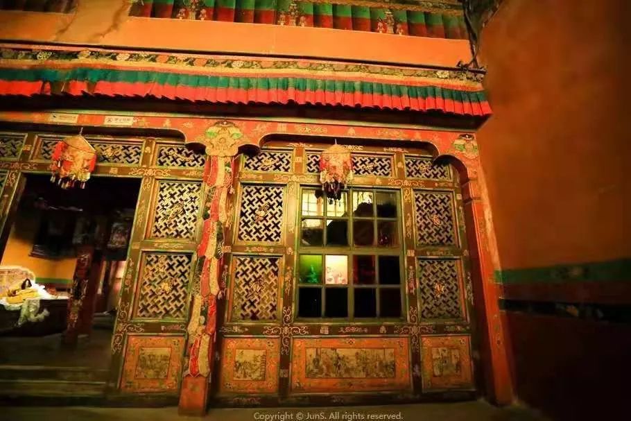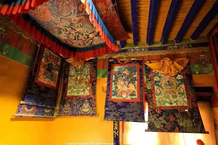 经堂:木地板铺成的高台,六个豪华的柱子支撑起整个经堂,中间横断一座汉式雕花门洞,上面镶有从英国进口的彩色玻璃,四面墙上挂满唐卡,陈设富丽堂皇。