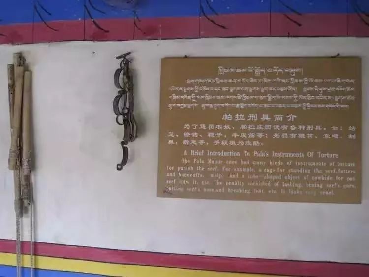 主体大楼楼道中,陈列着皮鞭、脚镣等刑具,这些都是旧西藏贵族压迫和统治农奴的工具。为了惩罚农奴,帕拉庄园设有各种刑具,如站笼、镣铐、鞭子、牛皮筒等,刑罚有鞭笞、掌嘴、割鼻、断足等,手段极为残酷。
