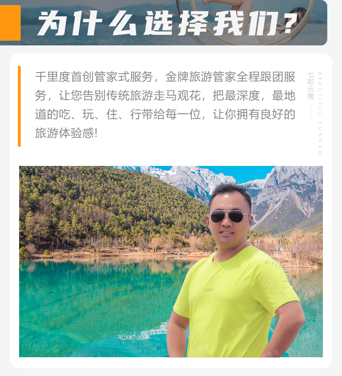 千里度旅行管家团队长期驻云南生活,了解更多云南行程文化,在旅行中陪玩陪逛,把控行程品质,全程服务质量监督,安全感爆棚,处理问题小能手等更多服务。想要了解更多的朋友可以问问我哈。