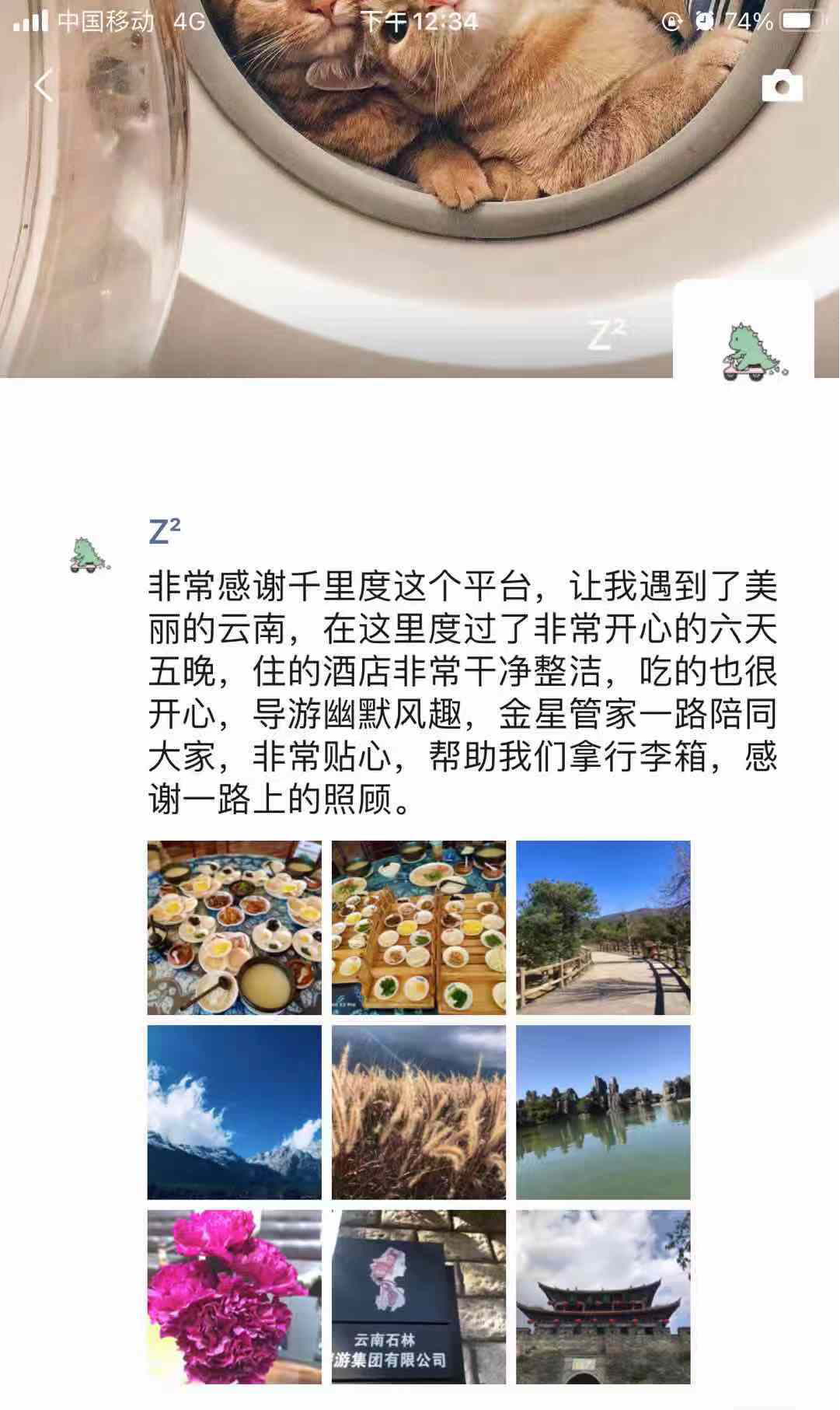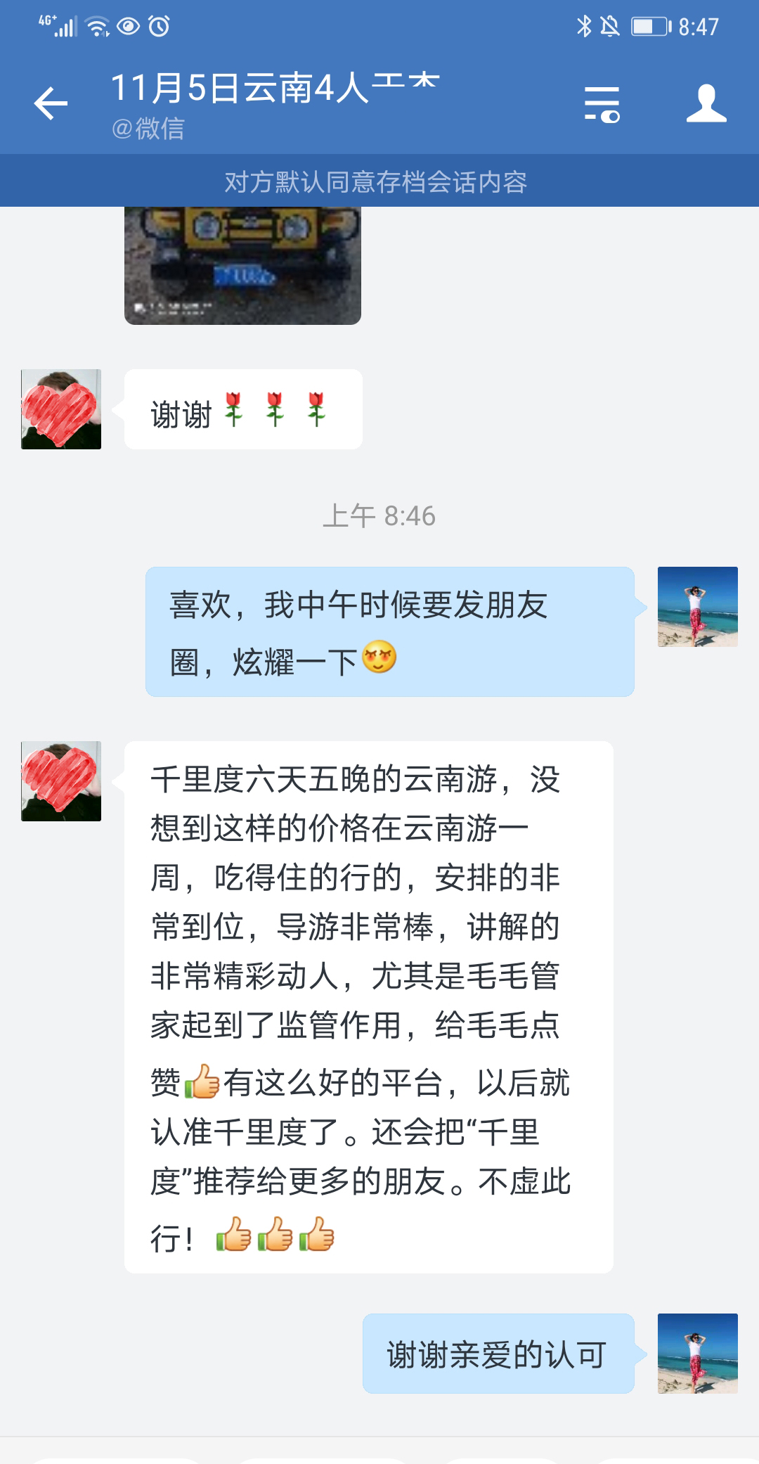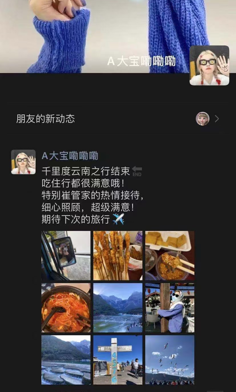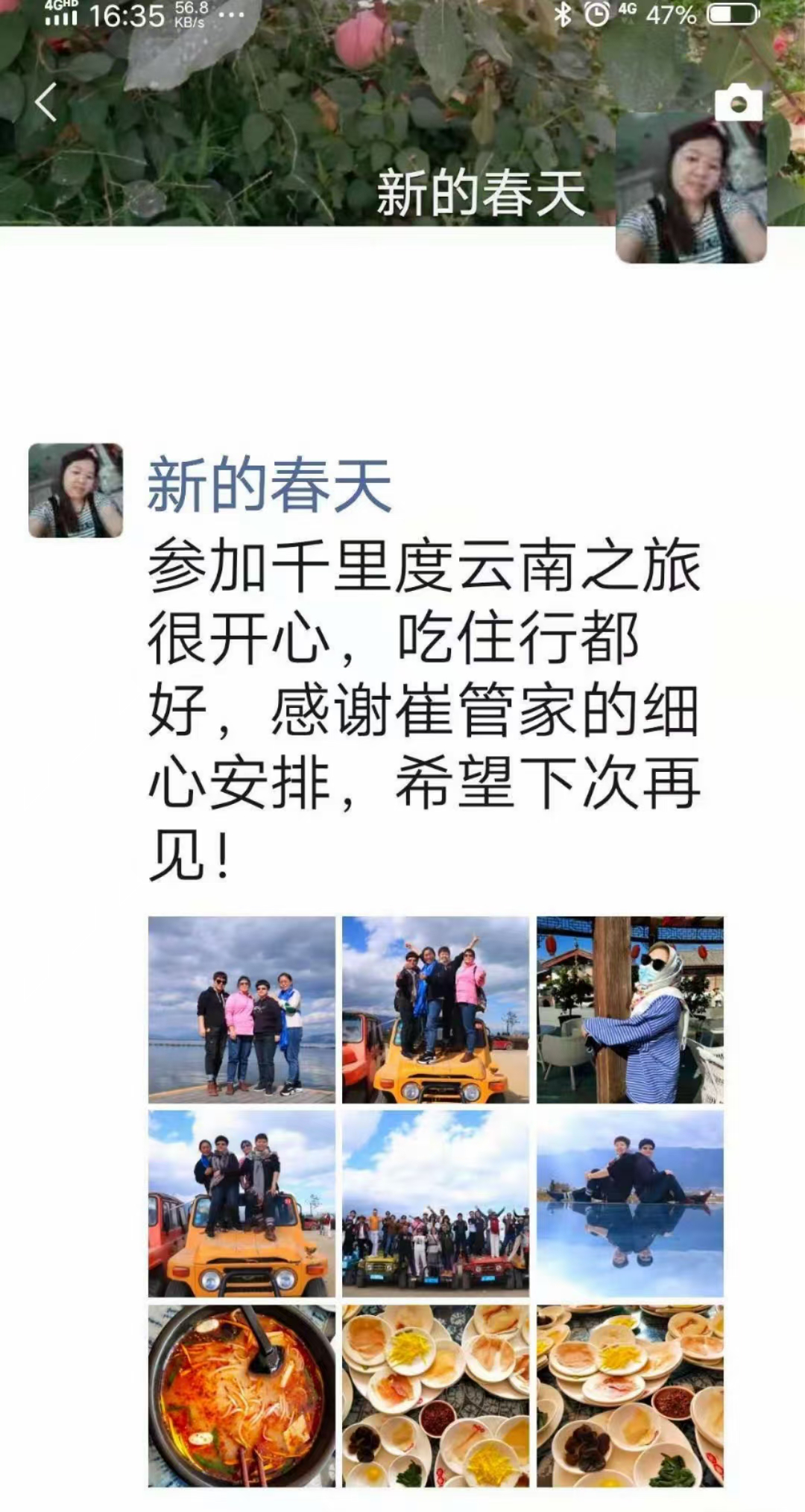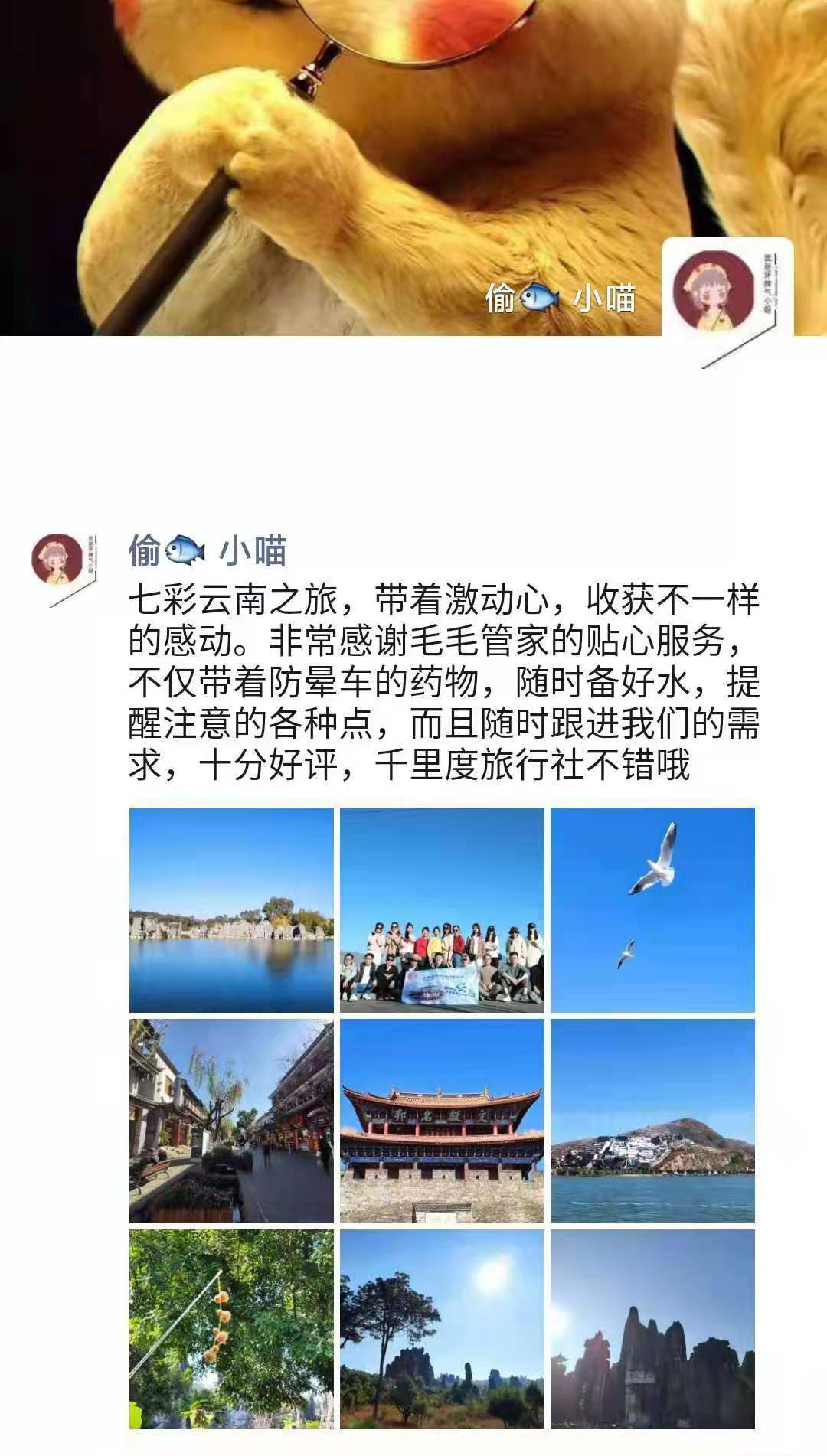 六天云南游,游客游玩回团的评价,没想到这样的价格在云南游一周真的超值。吃住行很到位,尤其是毛毛管家有着监管品质作用,给毛毛管家点赞。还说把“千里度”推荐给更多的朋友。