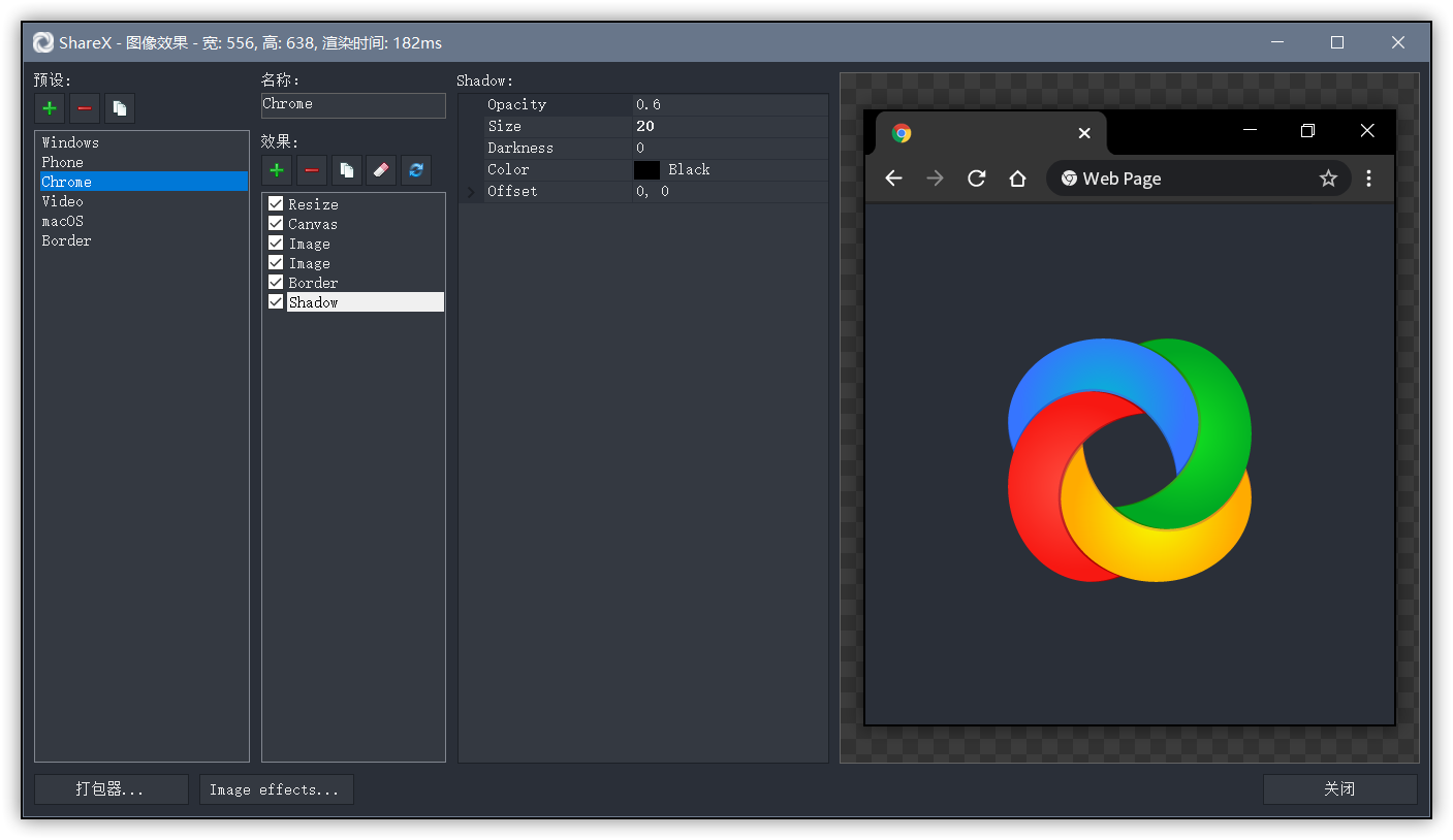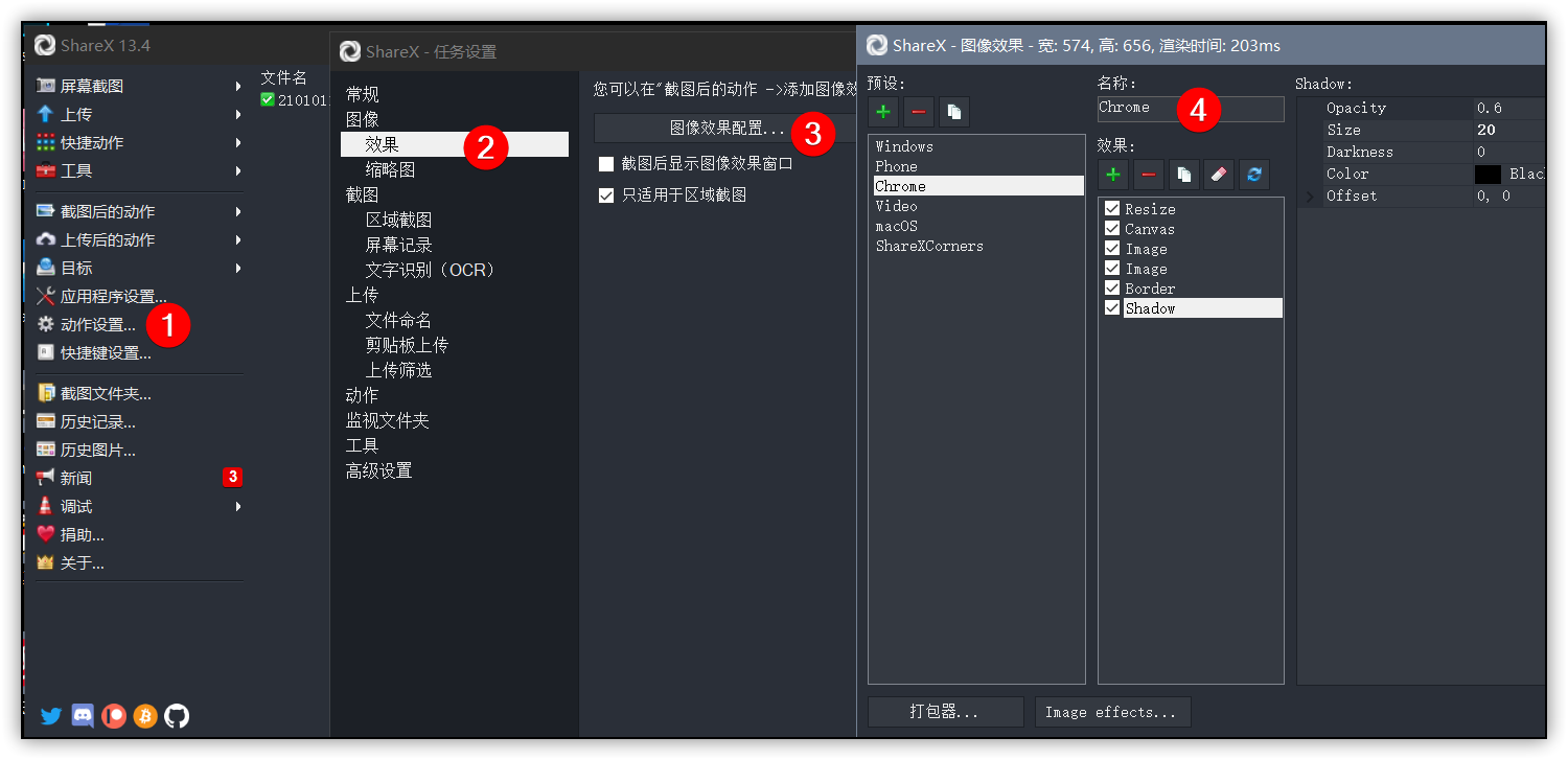 安装运行 ShareX 后,从主程序界面进入动作设置 - 效果 - 图像效果配置,来到配置界面,新建一个名为Chrome的效果。