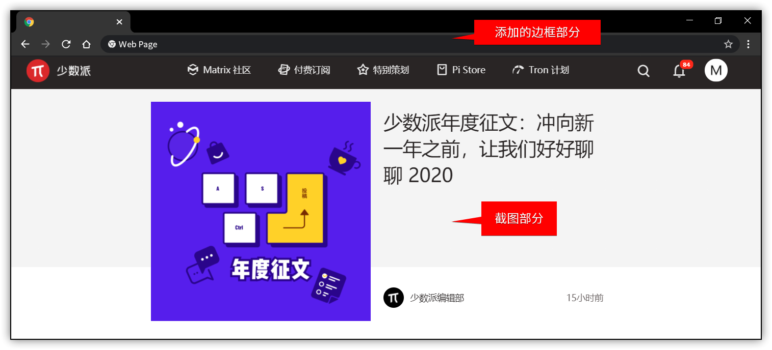 截取网页时,将浏览器的菜单、地址栏等一同截取进来可以更好地说明「此截图来自浏览器」。但为了隐藏书签栏、头像等私人信息,同时也为了适应各种截图的尺寸,后期添加的方式更为合理。期望的效果如下图所示: