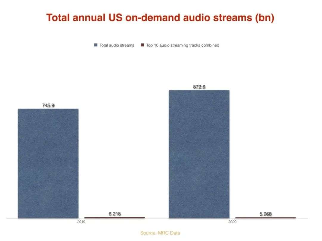 与上一年相比,2020年美国的音频流媒体总播放量增长了1267亿次,达8726亿次,年均增长17%。