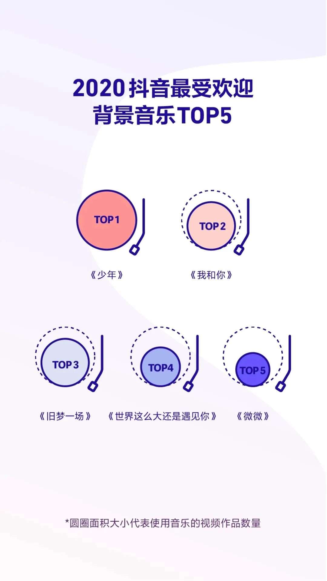 · 1月5日消息,抖音发布《2020抖音数据报告》显示,抖音国内日活用户突破6亿,日均视频搜索次数突破5亿。其中,《少年》是最受欢迎的BGM,后面依次是《我和你》《旧梦一场》《世界那么大还是遇见你》《微微》。