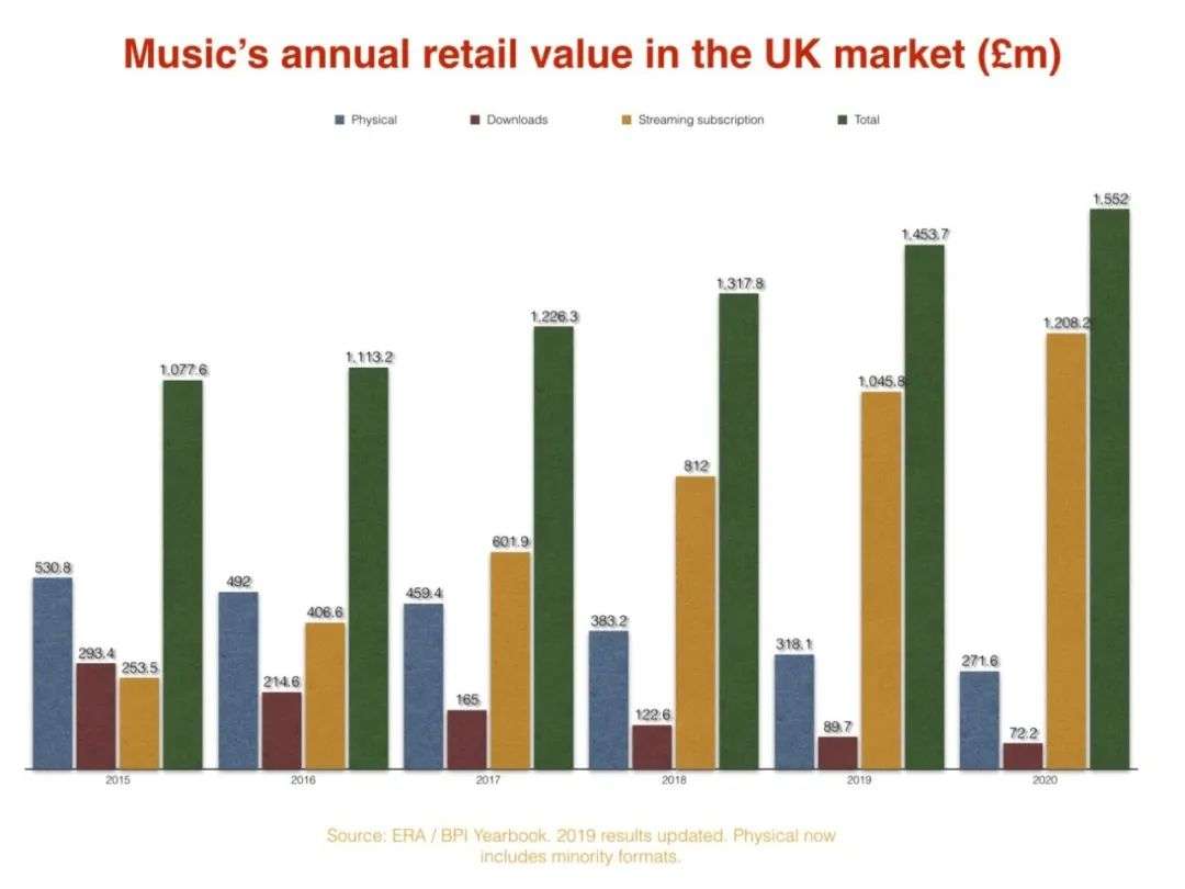 · 1月8日,根据英国娱乐零售商协会(ERA)发布的初步数据显示,2020年,英国消费者在录制音乐(包括实体和数字销售以及付费订阅)上的年度支出增长了9830万英镑(1.26亿美元),同比增长6.8%,增至至15.5亿英镑(19.9亿美元)。