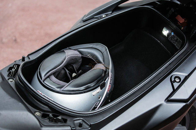 受限于中置发动机的布局,和运动型的设计,座桶空间并没有特别的大,只能放进去一顶全盔和一顶半盔,如果对空间有较大需求,只能选择加装尾箱扩充容量。