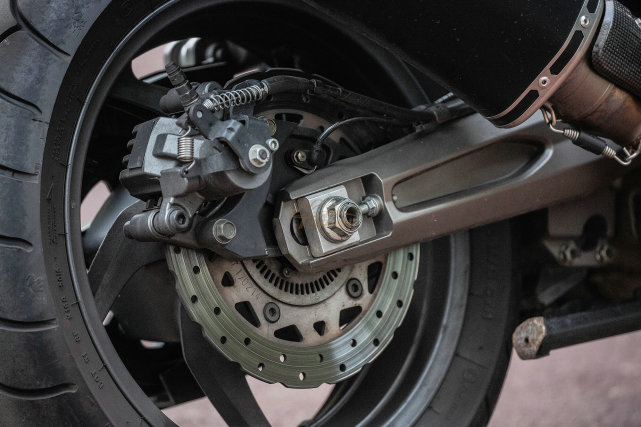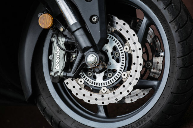 前280mm双浮动盘,Brembo四活塞卡钳,后260mm单盘,单活塞卡钳,41mm倒立式的前叉,单侧后避震,Bosch 9.1的双通道ABS,轻量化的合金框架车架,铝合金后平叉。