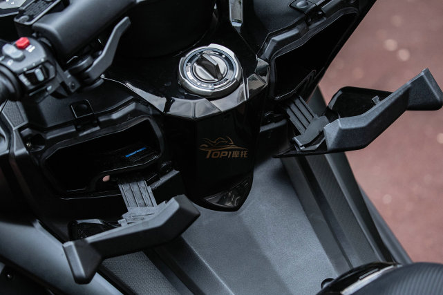 无钥匙启动系统是大踏板所必须具备的一向配置,在两侧分别有一个手套箱,左手边的更大里面具备12V点烟器接口,同时能够将手机放进去。右边空间比较小,只能够放下眼镜和钱包钥匙等物品。