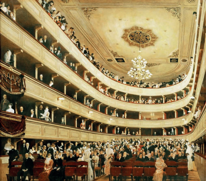 在维也纳东部的佩雷斯旧城堡剧院翻新之前,克里姆特被要求把剧院的场景画下来。于是他描绘了一次戏剧中场休息间隙时的景象。