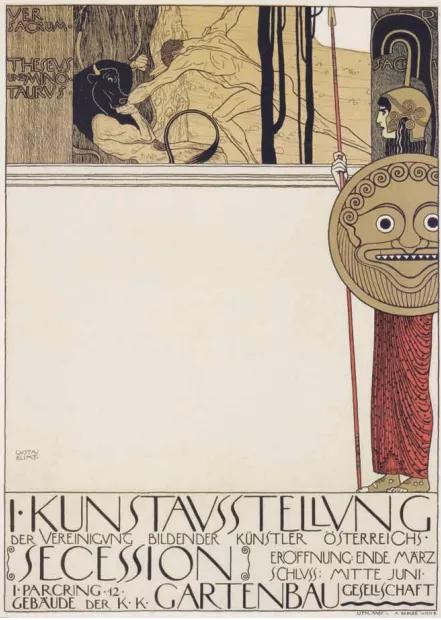 克里姆特为分离派的第一届展览绘制的海报表现了一个古希腊神话主题:忒修斯杀死米诺陶洛斯。米诺陶洛斯是希腊神话中克里特国王的妻子与牛生下的怪物,被国王关在克里特岛的迷宫里。